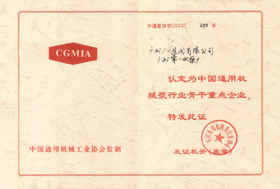 广州广一集团有限公司和广州市第一水泵厂被认定为“泵行业重点骨干企业”。